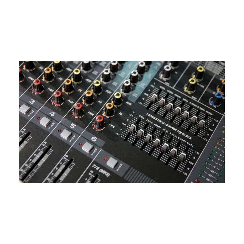 Mezcladora analógica. 6 entradas Mic/Línea / 1 estéreo. Reproductor mp3 con puerto USB. Ecualización estéreo de 7 bandas.