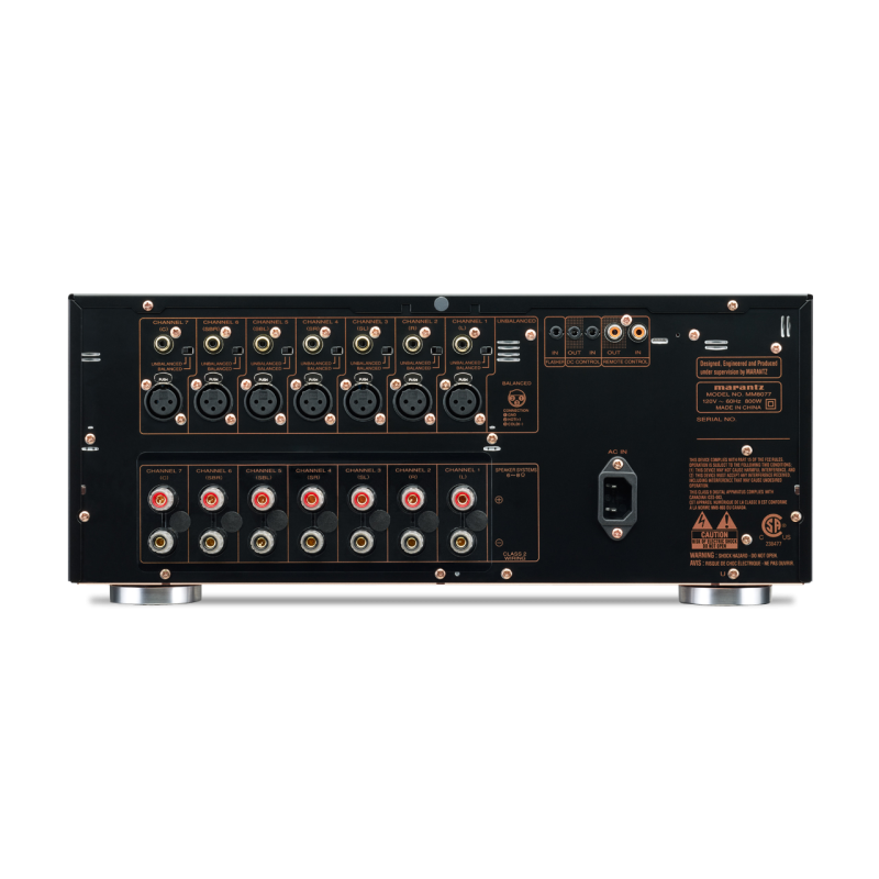 El MM8077 cuenta con una entrada de disparo de CC para control de encendido / apagado externo, y también hay tomas de entrada / salida de control remoto RC-5 duales para la conexión a un preamplificador / procesador Marantz A / V compatible.